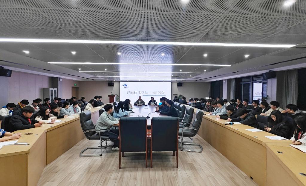 智能技术学院第二次学生干部例会于2025年12月1日在行政楼第三会议厅召开。本次例会由智能技术学院学工办主任贺潇、学工办副主任石瑜峰主持召开,参会人员有:主席团成员、助理团以及各部门干部。