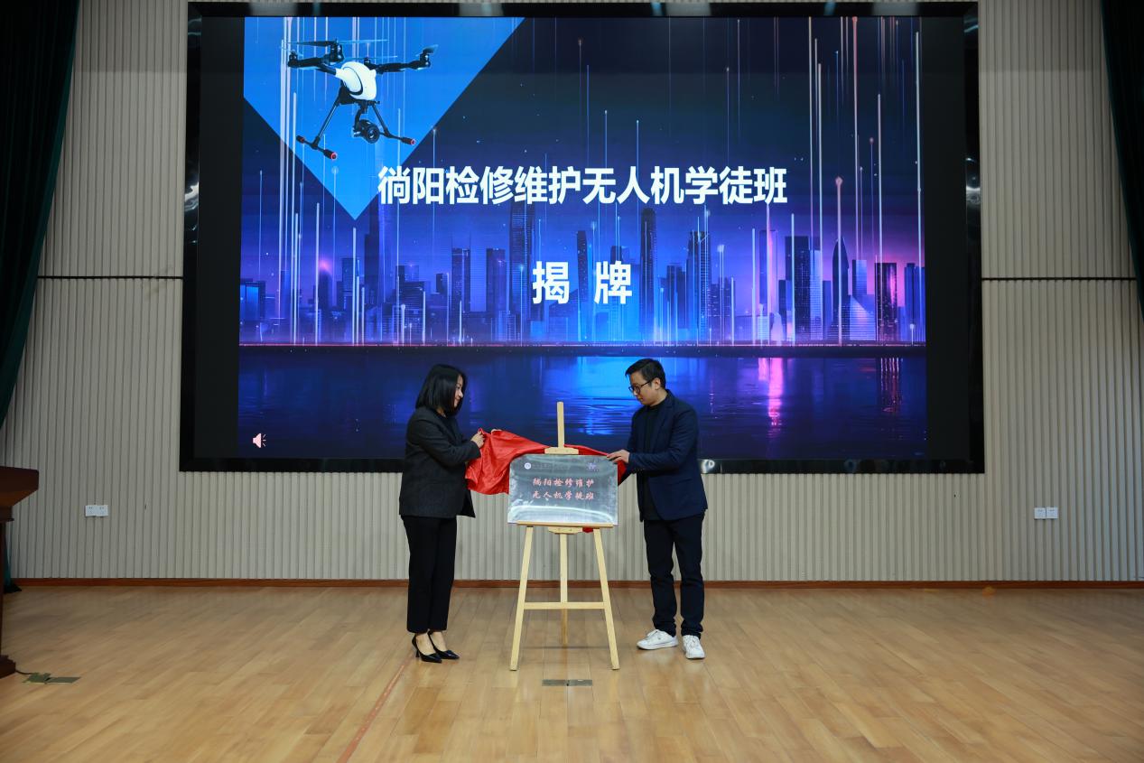 在授牌环节中,教研室主任朱强老师与章媛总经理共同为“徜阳检修维护无人机学徒班”揭牌,佟姗姗副书记与孙晓伟董事长共同为“长征·徜阳校外实习实训基地”揭牌,象征着该项目正式启动。