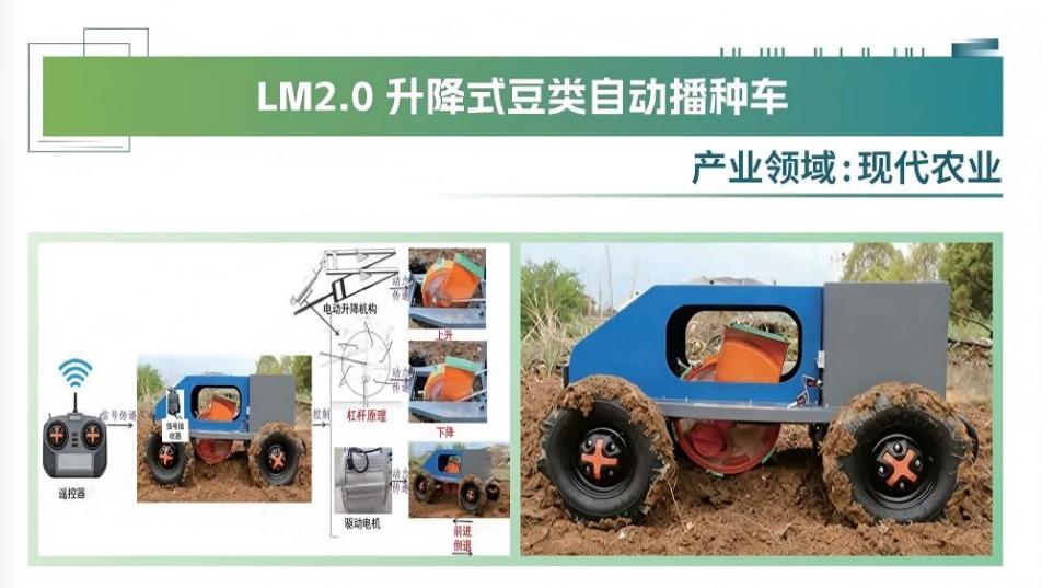 《LM2.0升降式豆类自动播种车》聚焦山地播种痛点,配置越野型轮胎,障碍通过性较强,适应浙江等七山一水二分田地貌。在梯田与崎岖土路、湿滑泥面上稳定前行、精准落籽,远程无人化智能作业,降低陷车打滑风险,确保坡地作业高效,提升覆盖率与质量为山地农业带来可靠保障与效益提升。技术成熟、可推广性强,获得第25届浙江省大学生物理创新竞赛一等奖等2项、实用新型专利授权1项,产品将进入中试阶段。