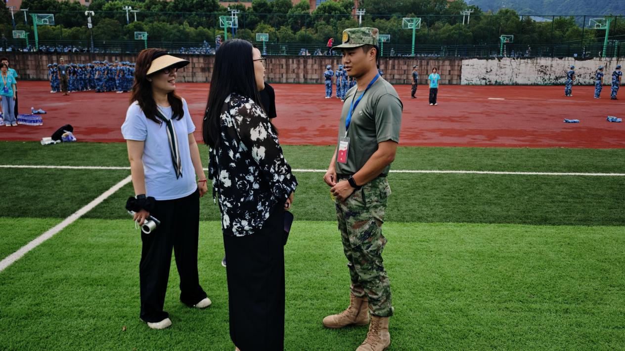 佟珊珊书记,贺潇主任,石瑜峰主任细致察看训练实况,与承训教官亲切交流,对其科学施训表示充分肯定,并嘱咐要做好防暑保障。在看望参训新生时,关切询问同学们的训练感受,对大家展现出的昂扬斗志表示赞赏。要求班助做好后勤保障,确保军训任务圆满完成。