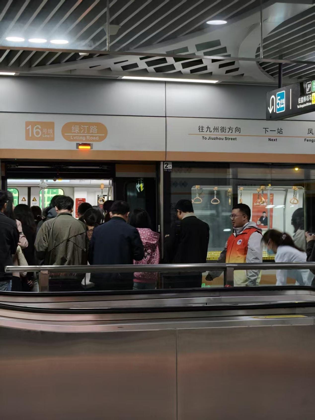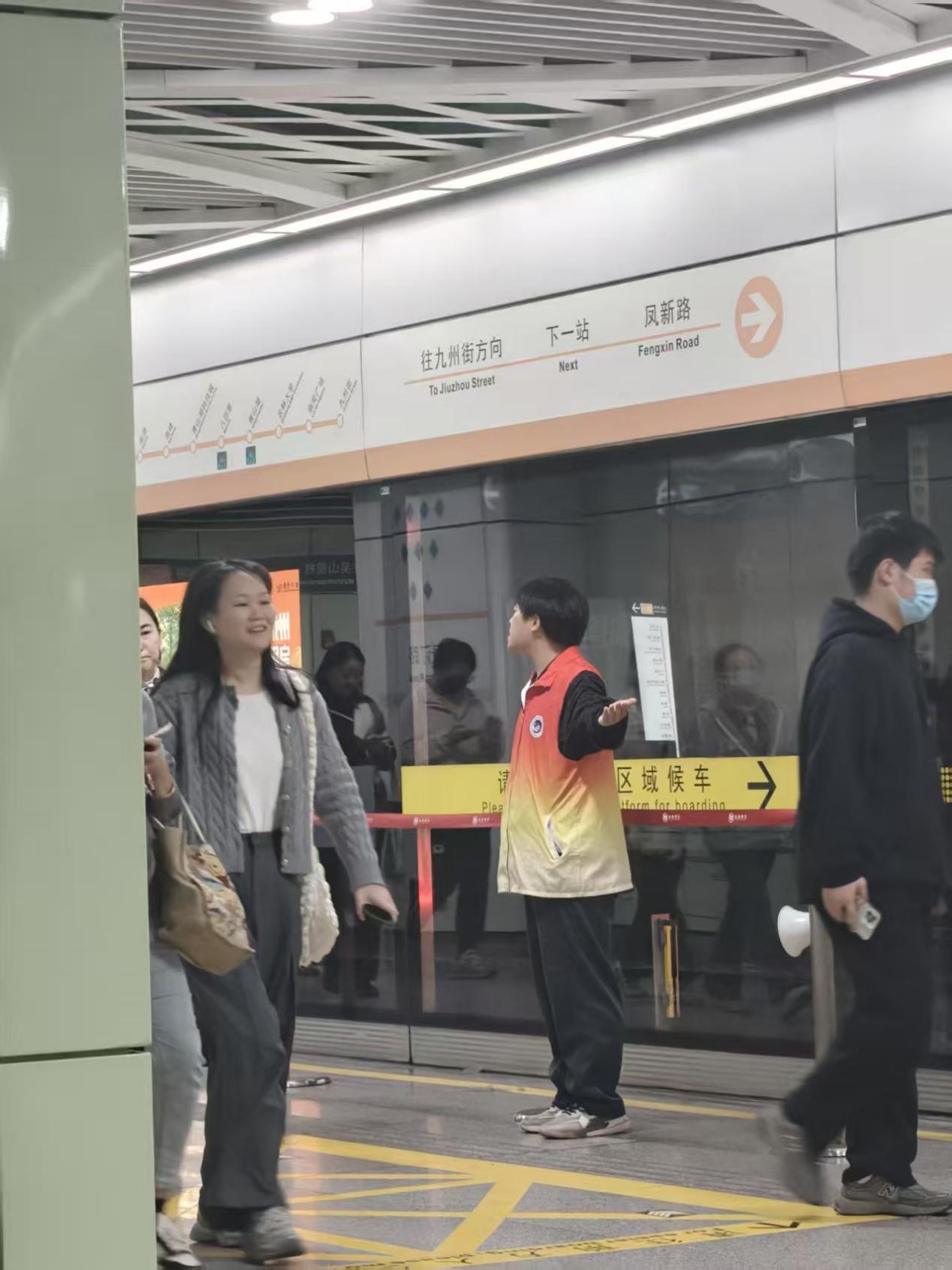 高峰客流时段,志愿者们更是成为站内“流动的服务岗”。在换乘通道,大家配合地铁工作人员疏导人流,通过手势引导、分流提示等方式,缓解高峰拥堵压力;针对行动不便的乘客,志愿者们主动提供帮扶,从安检口到站台、从车厢到出站口,全程陪护保障出行安全,用实际行动诠释“志愿红”的温度与担当。