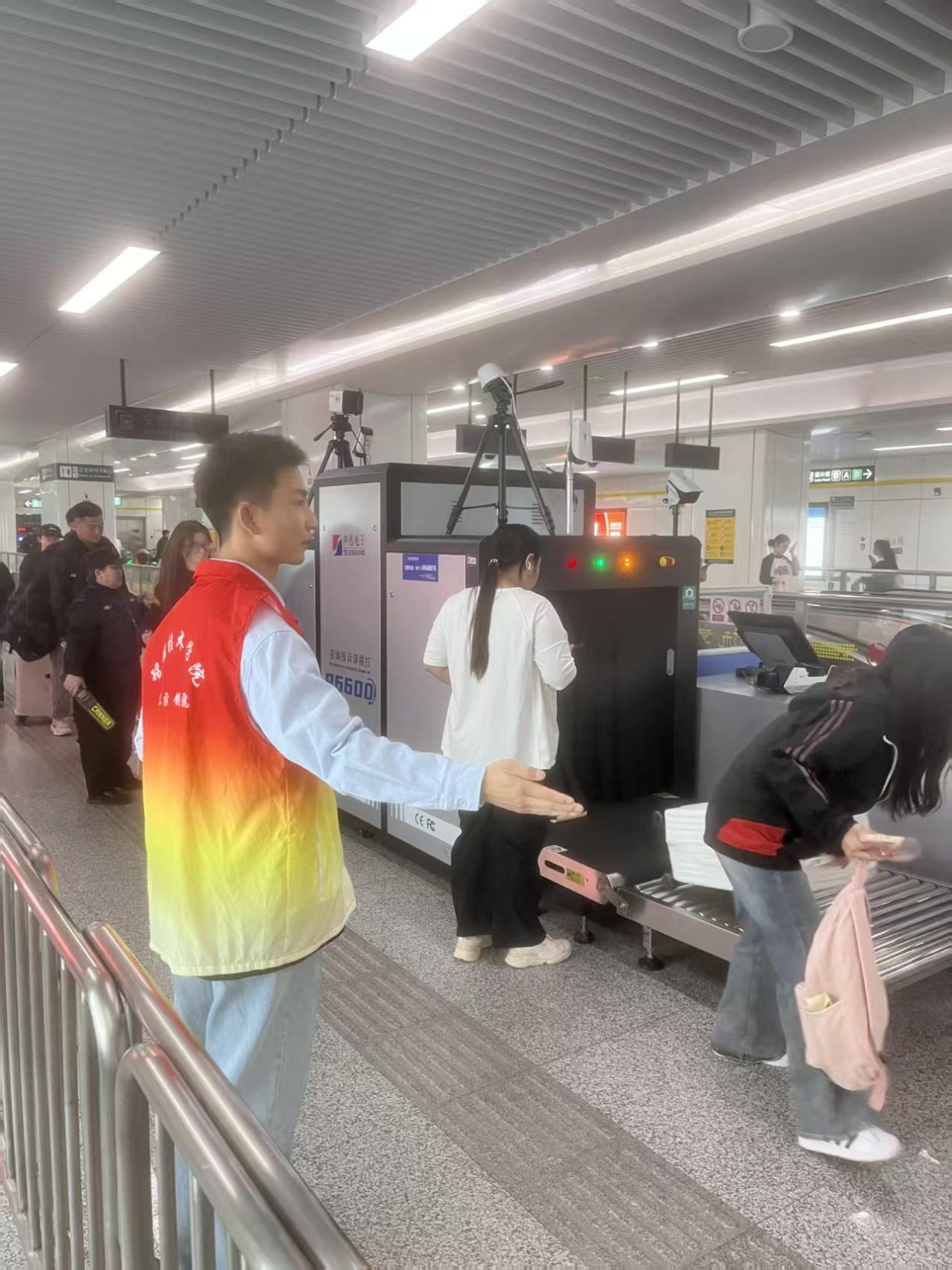 志愿者身着统一标识服装,精神饱满抵达地铁站。本次活动聚焦地铁运营服务全流程,组织学生志愿者参与安检协助、客流引导、应急响应等实战环节,学子们迅速到岗,投入紧张有序的服务工作,在城市交通动脉中书写青春服务答卷。