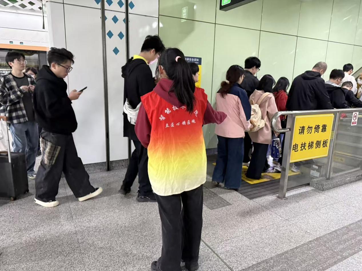 周一在绿汀路站,志愿者们迅速熟悉岗位职责,在安检区耐心协助乘客规范放置行李,提升通行效率;站台层则有序引导乘客文明候车,耐心解答线路咨询,营造安全、有序的乘车环境。