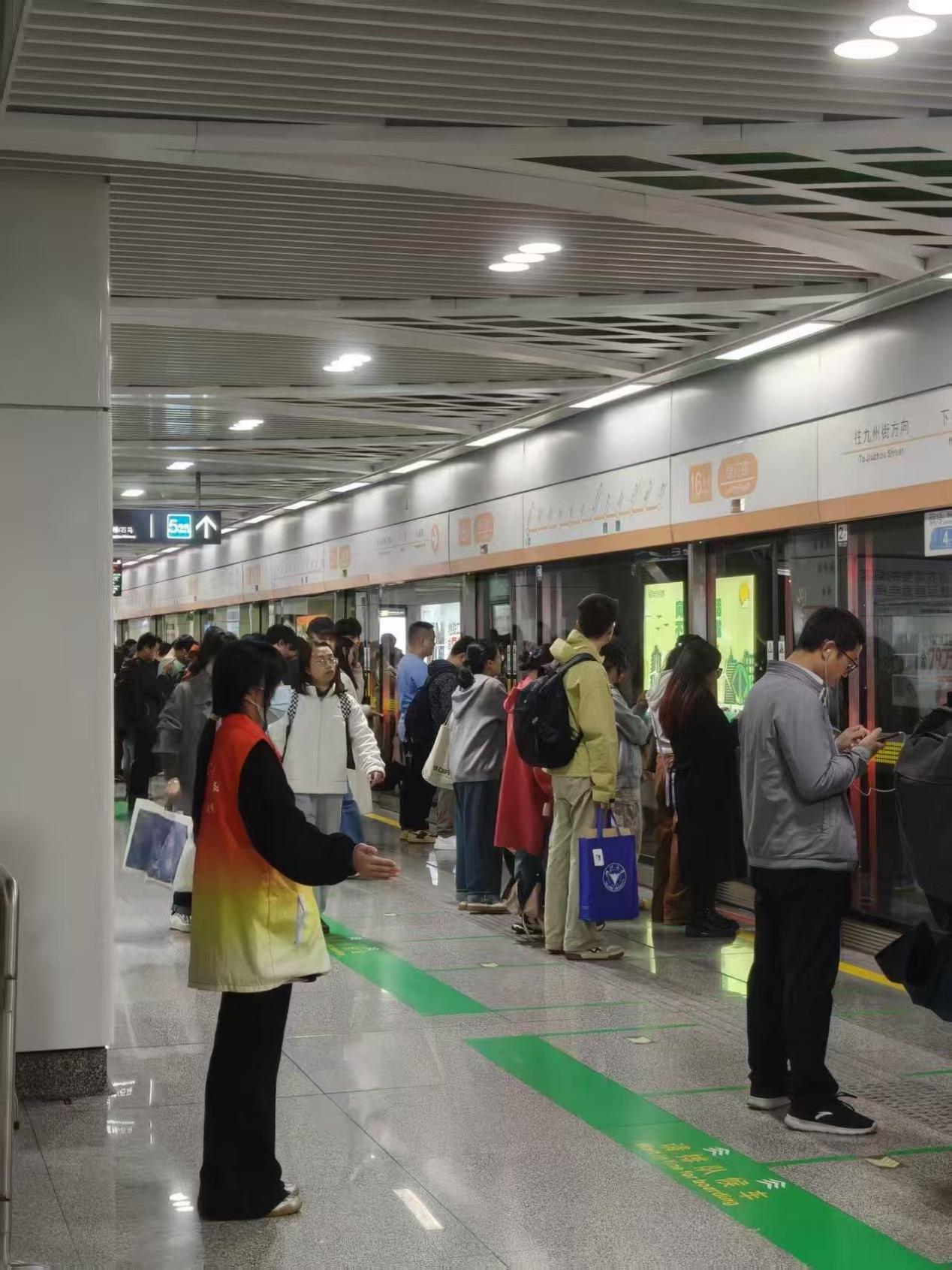 周五的服务覆盖小和山与绿汀路两站。面对周末前客流小高峰,志愿者们灵活调度,在换乘通道与出入口协同工作人员疏导人流,有效缓解拥堵。遇到老年人与行动不便的乘客,大家主动上前搀扶、全程陪护,用实际行动传递“杭州地铁,贴心相伴”的服务理念。