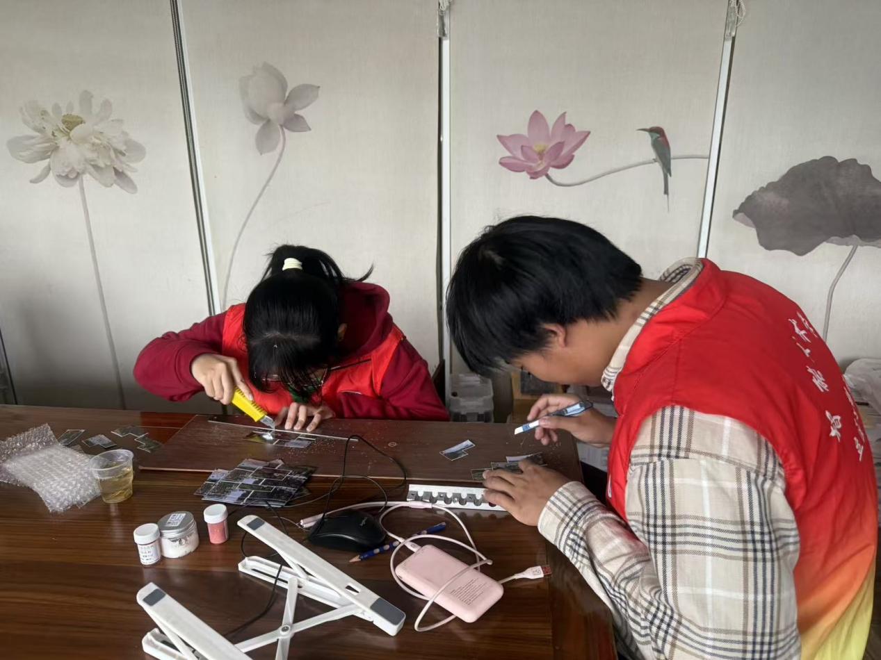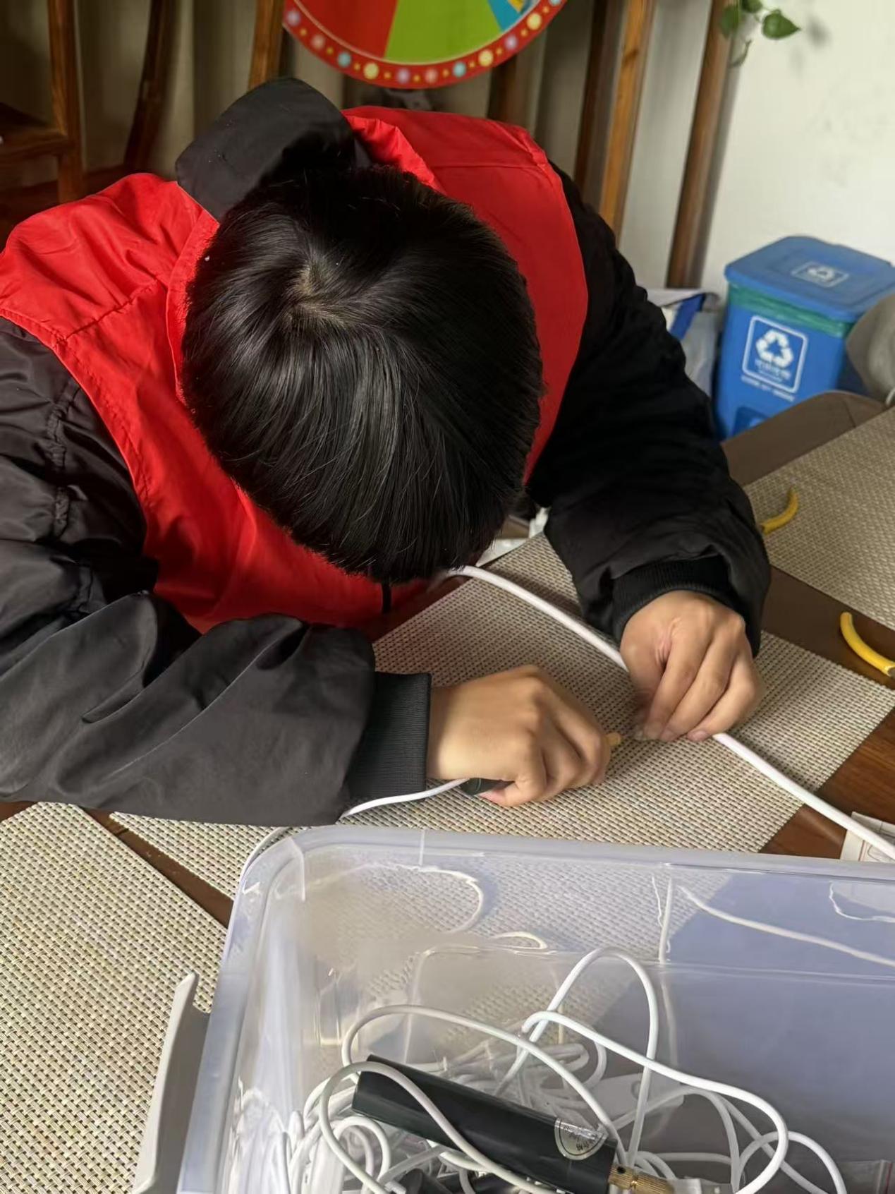 志愿者们率先在美育工作室启动材料筹备:自主分拣电线配件、拼图卡片等手工物料,队员们手拿小电钻,熟悉着穿孔流程,新奇的操作给大家带来了别样的体验,结合工作室的工具设备规划创作步骤,从分类收纳到工具调试均独立完成,展现了良好的自主统筹能力。