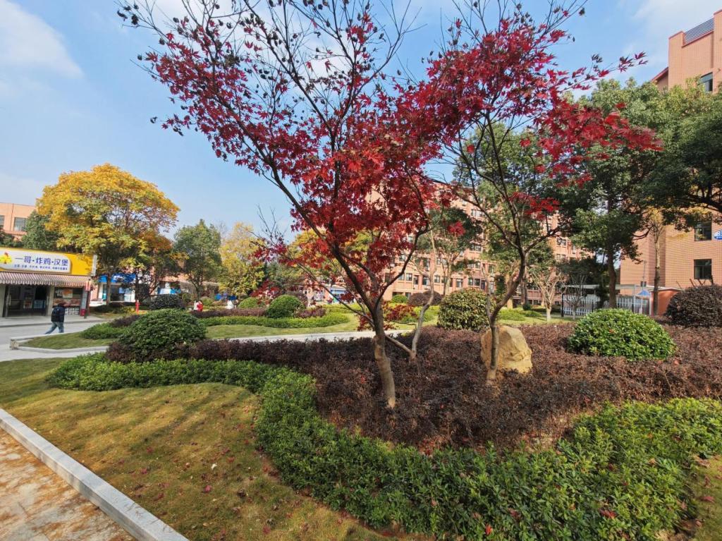 晴蓝的天衬着校园里最热烈的秋——那株红枫像蘸满朱砂的笔,把细碎的叶瓣缀在枝桠上,风一吹就晃出连片的艳色。旁边的树半笼着鹅黄,和深绿的矮丛、褐紫的灌丛叠成软乎乎的色块,石球卧在其间,沾了点叶的暖。