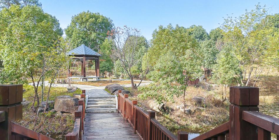 这方校园角落,像被时光轻揉过的诗行。木栈道浸着浅淡的木纹,牵起一汪静水与葱茏草木,风掠过新叶时,连空气都裹着清润的香。远处的亭子是水墨里的闲笔,青瓦木柱,衬着疏疏朗朗的树影,石径绕着草色蜿蜒,连石块都裹着软茸茸的绿意。