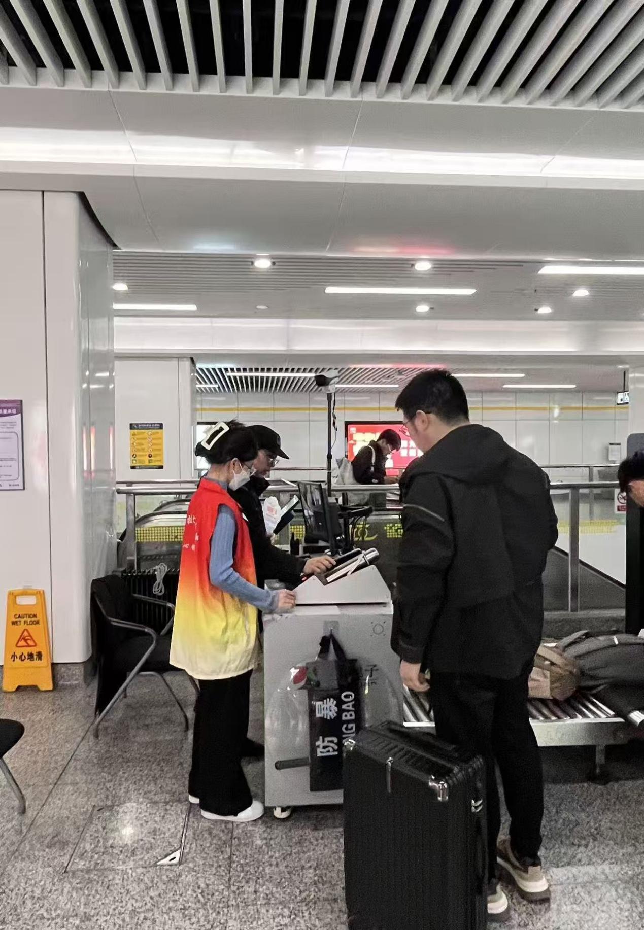 活动伊始,志愿者们先完成了系统的岗位实操培训,随后迅速投入服务。在绿汀路站安检区域,大家耐心指引乘客按规范摆放随身物品,协助工作人员提升通行效率;站台之上,志愿者们以规范站姿提醒乘客有序候车,对线路走向、换乘路线、站点周边设施等高频问题,逐一细致解答,全力保障乘车环境的安全顺畅。