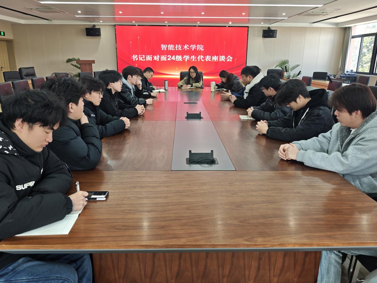 为深入践行“以生为本”的育人理念,搭建师生高效沟通桥梁,精准回应学生成长诉求。2026年1月8日,智能技术学院在第三会议室举行“书记面对面24级学生代表座谈会”。智能技术学院团总支副书记佟珊珊、智能技术学院学工办主任贺潇、智能技术学院学工办副主任石瑜峰及24级各班级学生代表齐聚一堂,以零距离交流的方式倾听学生心声,共商学校发展良策。