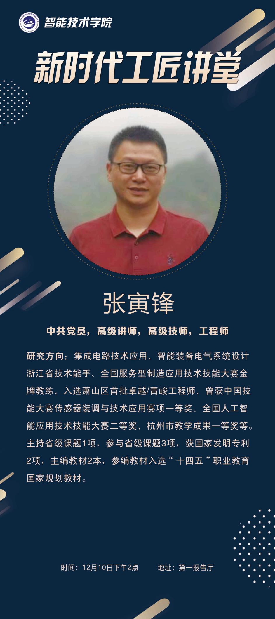 为大力弘扬劳模精神、劳动精神、工匠精神,引导广大青年树立技能成才、技能报国的远大志向,我校特举办新时代工匠讲堂活动,诚邀行业顶尖工匠走进校园,分享匠心故事,传授精湛技艺。本期邀请到的是张寅锋老师。张寅锋作为中共党员,高级讲师、高级技师、工程师,深耕集成电路与智能装备领域,技赛屡获大奖,教研、专利、教材成果丰硕。本次讲课,机会难得,让我们尽情期待!